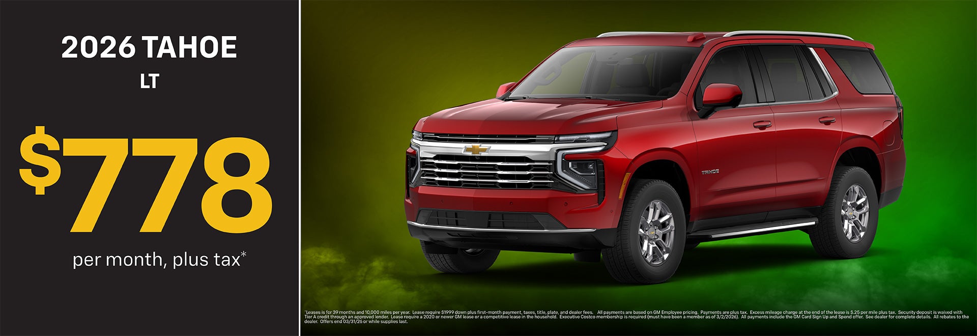 *Leases is for 39 months and 10,000 miles per year. Lease require $1999 down plus first-month payment, taxes, title, plate, and dealer fees. All payments are based on GM Employee pricing. Payments are plus tax. Excess mileage charge at the end of the lease is $.25 per mile plus tax. Security deposit is waived with Tier A credit through an approved lender. Lease require a 2020 or newer GM lease or a competitive lease in the household. Executive Costco membership is required (must have been a member as of 3/2/2026). All payments include the GM Card Sign Up and Spend offer. See dealer for complete details. All rebates to the dealer. Offers end 03/31/26 or while supplies last.